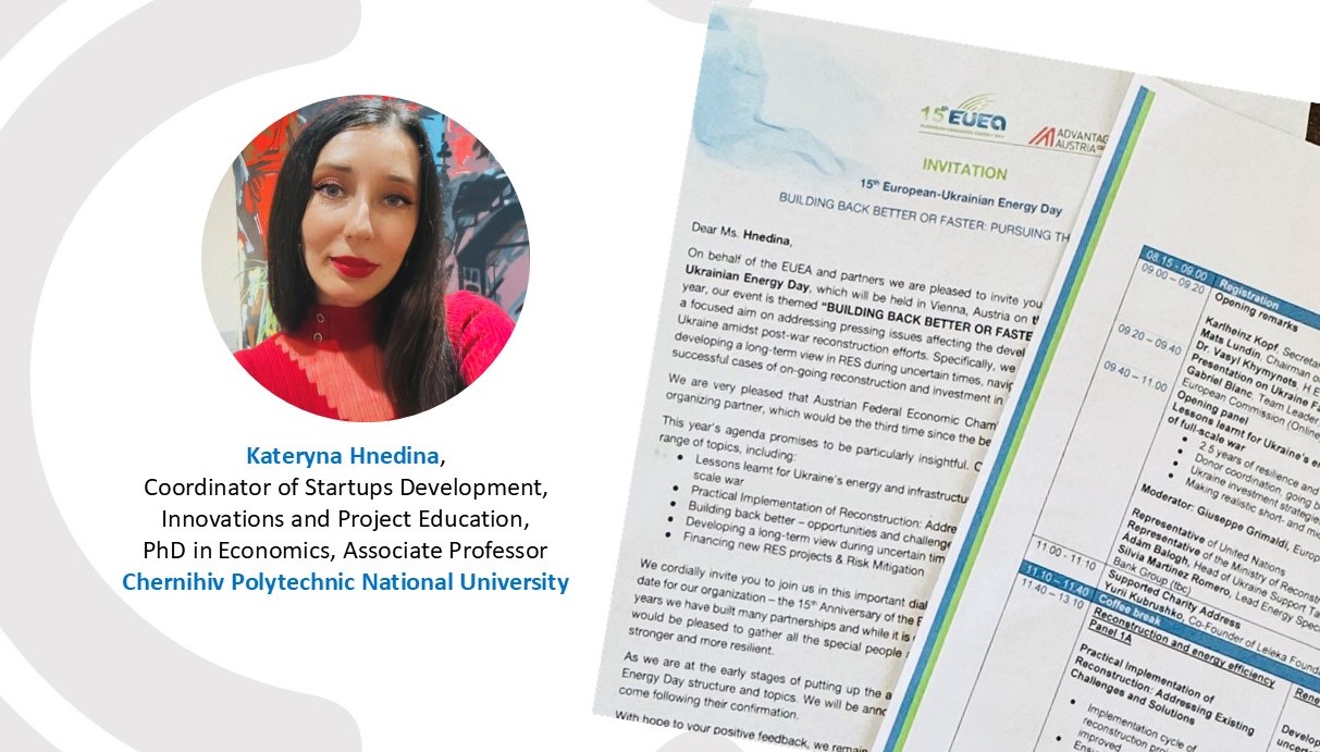 29 жовтня 2024 року координатор розвитку стартапів, інновацій та проєктного навчання НУ «Чернігівська політехніка», к.е.н., доцент Гнедіна Катерина Володимирівна взяла участь у 15-му «Європейсько-Українському Енергетичному Дні» («Building back better or faster: Pursuing the Balance»), який відбувся в м. Відень у змішаному форматі.