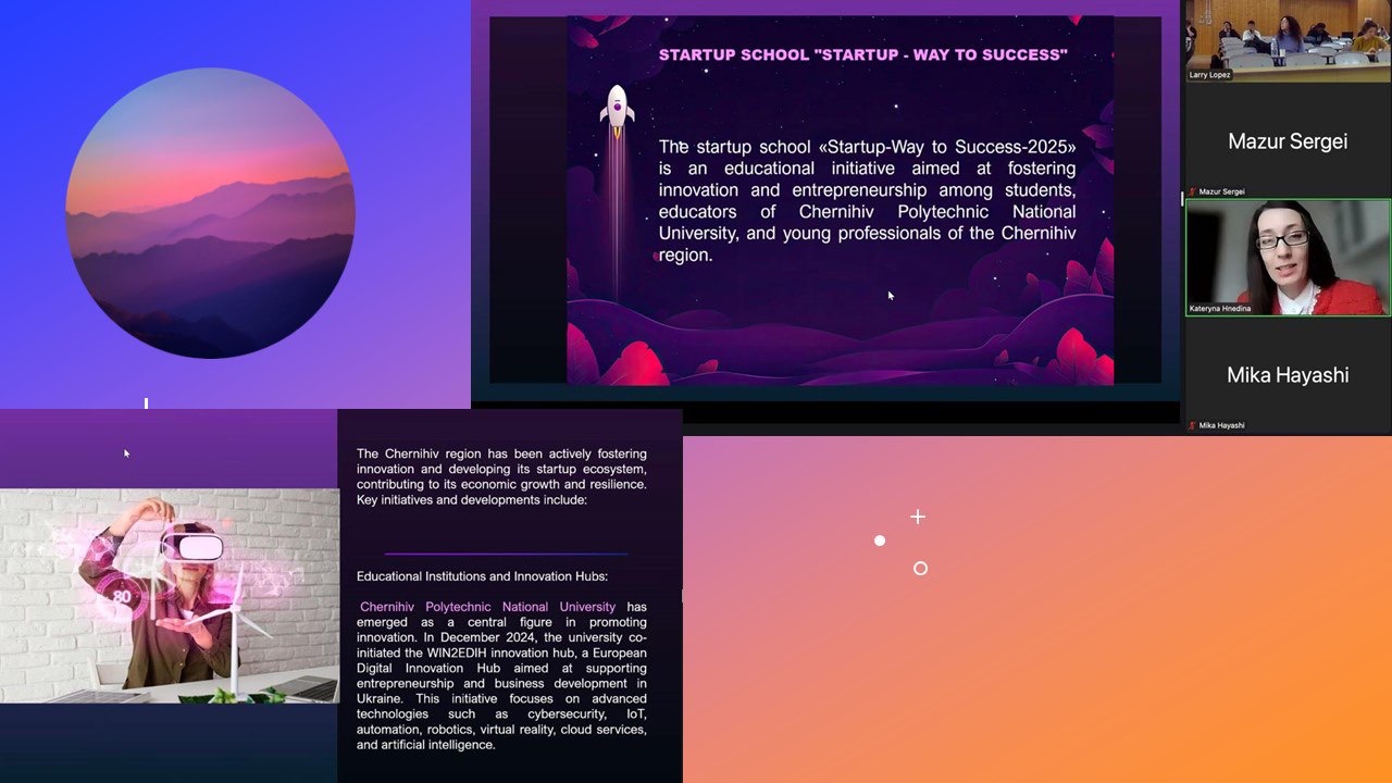 Координатор розвитку стартапів, інновацій та проєктного навчання НУ «Чернігівська політехніка», к.е.н., доцент Гнедіна Катерина Володимирівна взяла участь в міжнародному симпозіумі «Symposium on Environmental Sciences and Sustainability in Asia and Europe», який відбувся в Японії (м. Цуруока, м. Ямагата; у змішаному форматі) та був організований Об’єднаною вищою школою сільськогосподарських наук (UGAS) та Університетом Ямагата (YU).