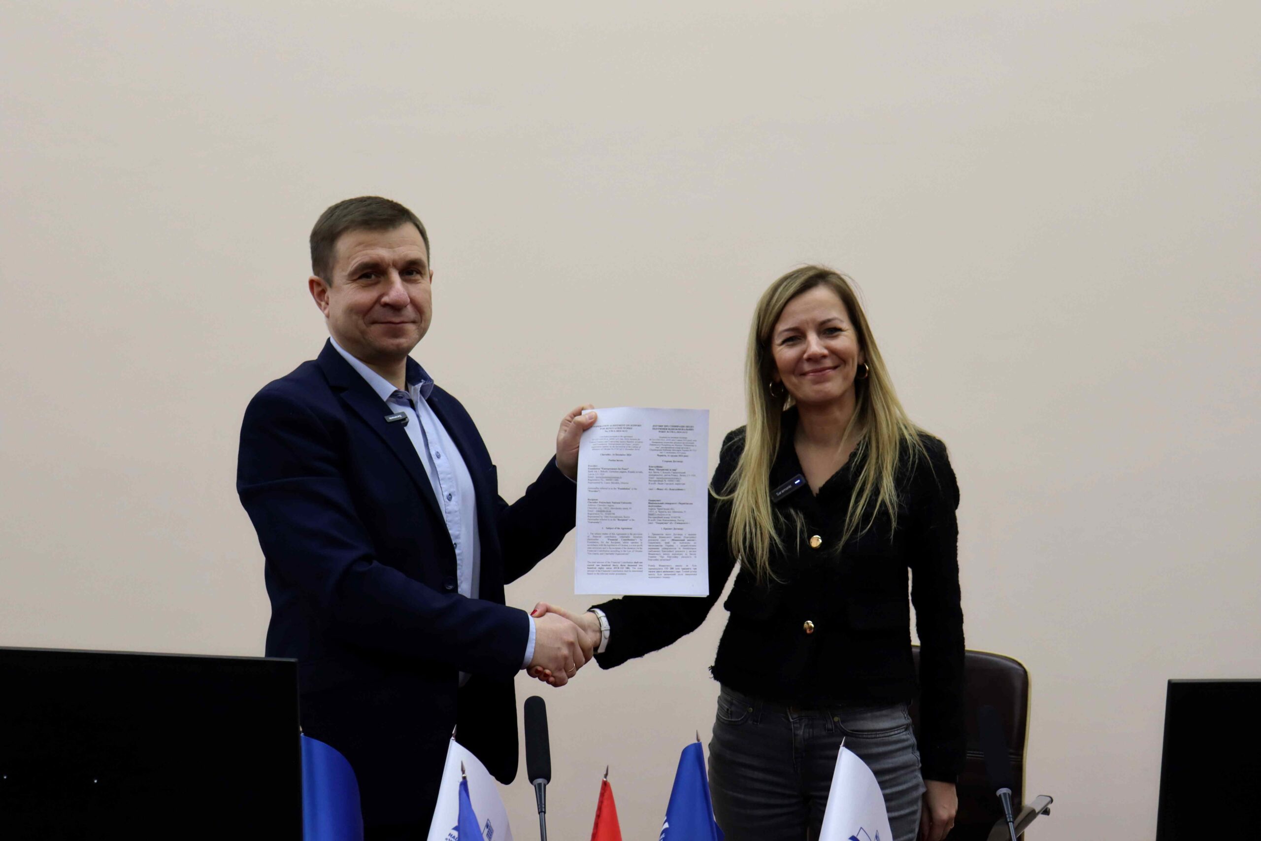 16 грудня між Фондом Латвійської Республіки «Підприємці за мир» на чолі з Лаурою Скроделе та Національним університетом «Чернігівська політехніка», представленим ректором Олегом Новомлинцем, відбулося підписання угоди про співпрацю. Угода спрямована на відновлення пошкодженої інфраструктури університету.