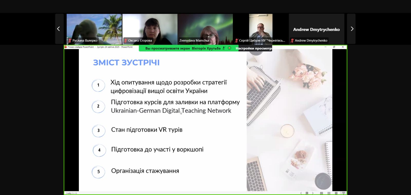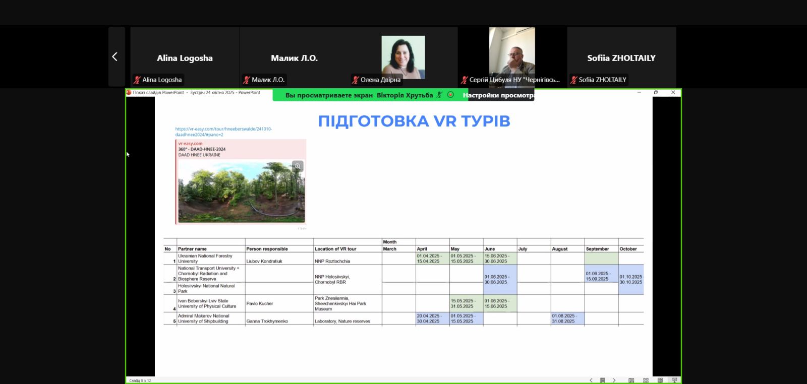 25 квітня 2025 року відбулася робоча зустріч партнерів міжнародного проєкту “Ukrainian German Teaching Network for a Digital Transformation of Environmental Education. (Consolidation and Expansion Phase 2025)», який реалізується під патронатом Університету сталого розвитку м. Еберсвальде (HNEE, Німеччина), учасником якого є НУ «Чернігівська політехніка», зокрема, кафедри харчових технологій та екології і кафедри аграрних технологій і лісового господарства.