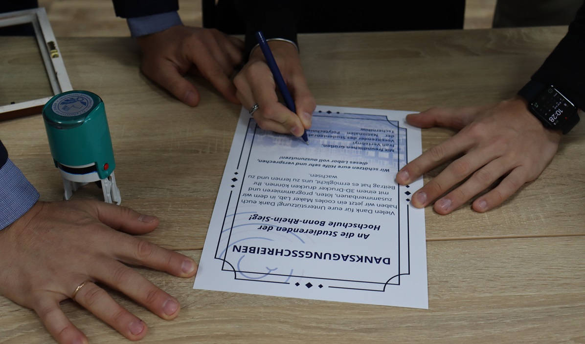 Ми щиро дякуємо студентам та випускникам, студентській спілці та співробітникам Університету прикладних наук Бонн-Рейн-Зіг за їхню важливу підтримку! Завдяки вашій допомозі наші студенти тепер мають чудову можливість навчатися, експериментувати та створювати інноваційні проєкти в просторі, де кожен може спробувати свої сили у конструюванні, електроніці та програмуванні. Ваша допомога відкриває перед нами нові горизонти!