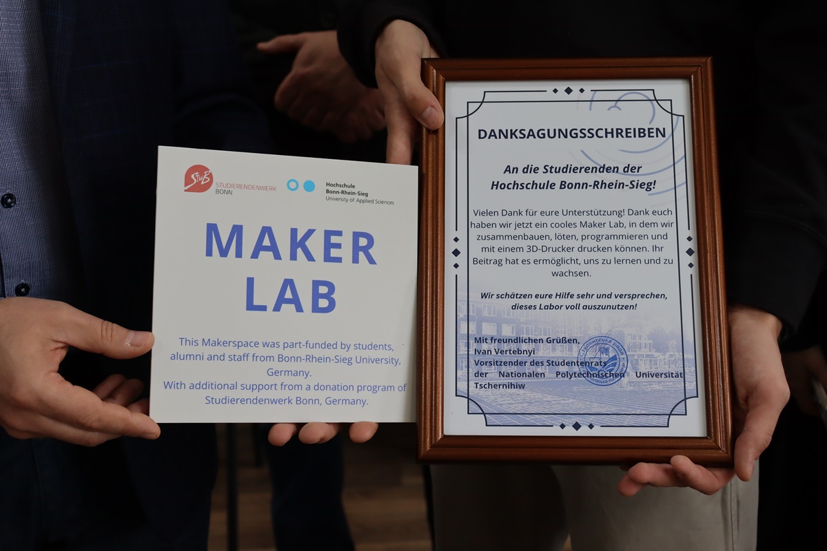 Цей унікальний простір, обладнаний сучасними інструментами для паяння, програмування та роботи з 3D-принтерами, дасть можливість створювати нові проєкти та вдосконалювати технічні навички. Особливо приємно зазначити, що цей Makerspace став реальністю завдяки фінансовій допомозі від студентів, випускників та співробітників Hochschule Bonn-Rhein-Sieg University of Applied Sciences (Німеччина), та студентської спілки “Studierendenwerk Bonn”. Ця міжнародна співпраця є символом єдності та спільного прагнення до розвитку науки та технологій.