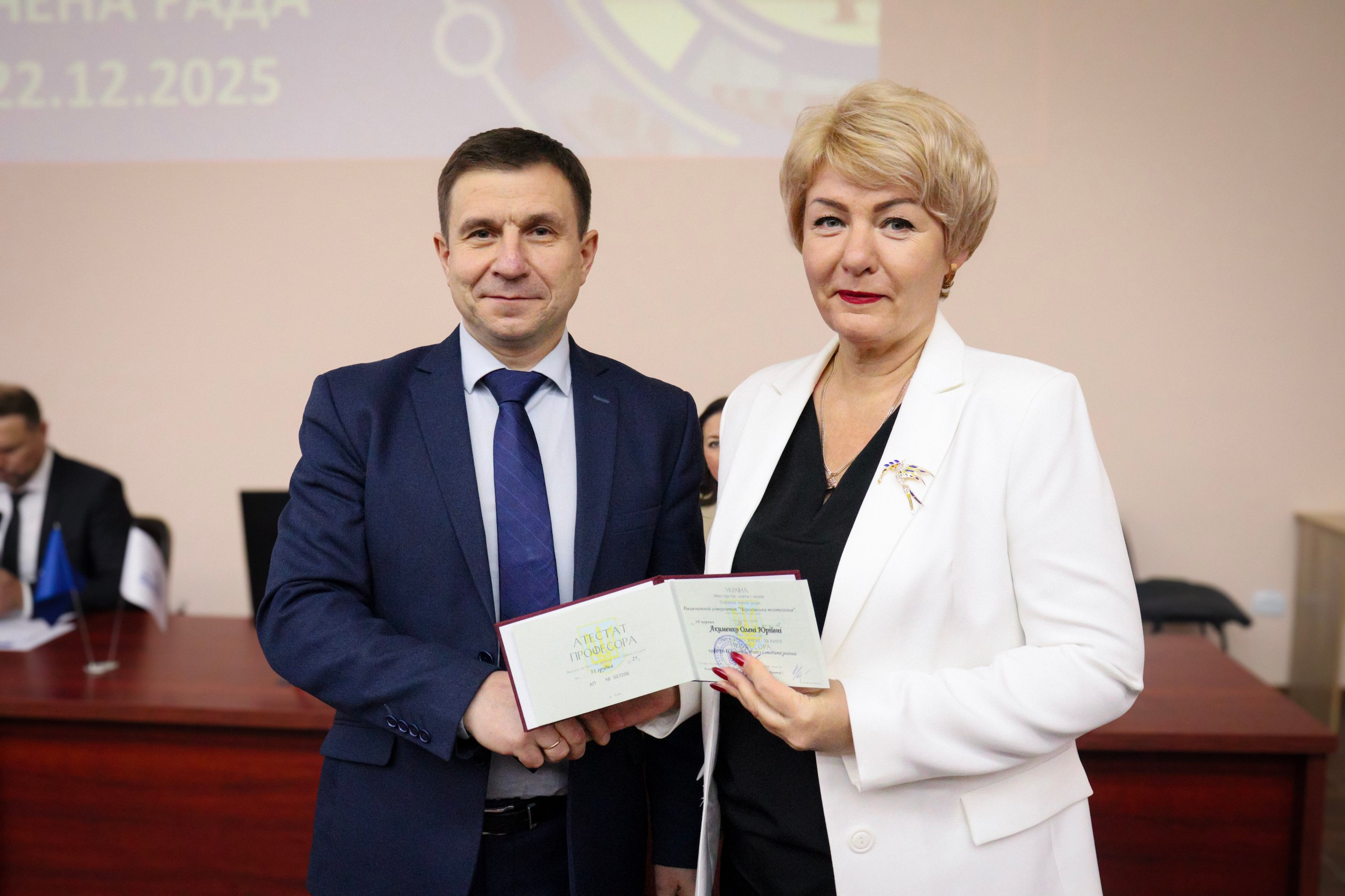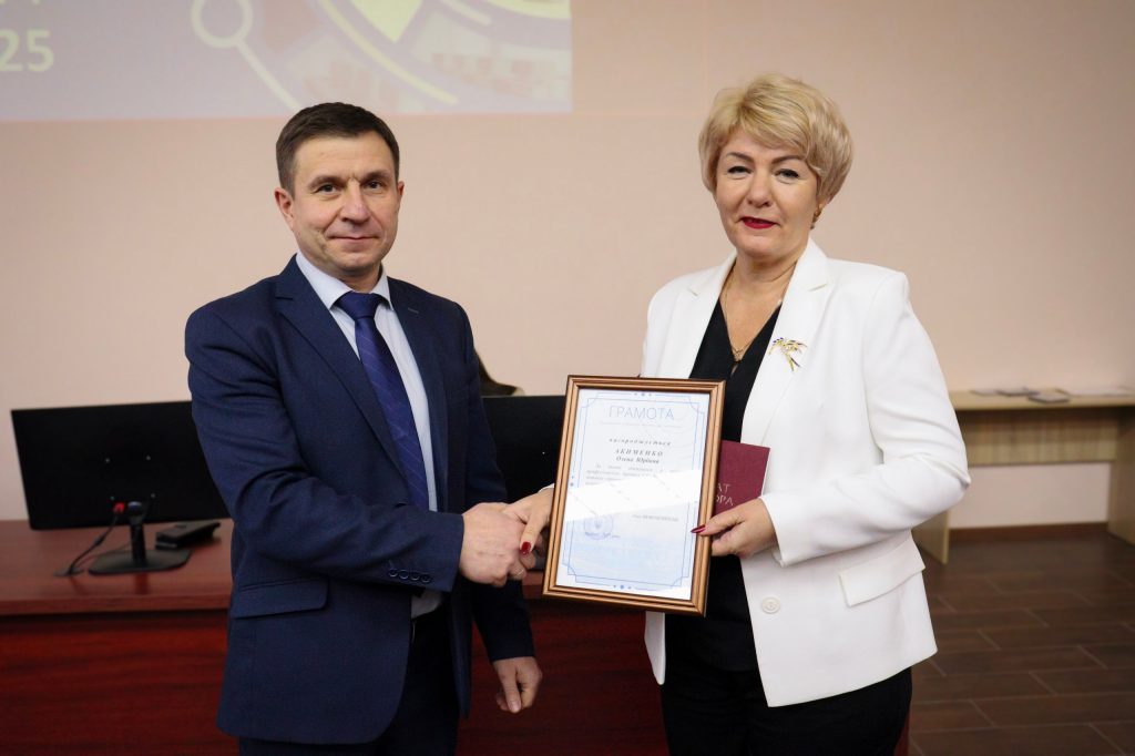 Вчене звання професора та грамоту університету було вручено Акименко Олені Юріївні, професору кафедри економіки, обліку та аудиту – за значні досягнення у роботі , професіоналізм, тривалу і бездоганну працю, активне сприяння формуванню та зміцненню культури академічної доброчесності серед здобувачів вищої освіти НУ “Чернігівська політехніка”.