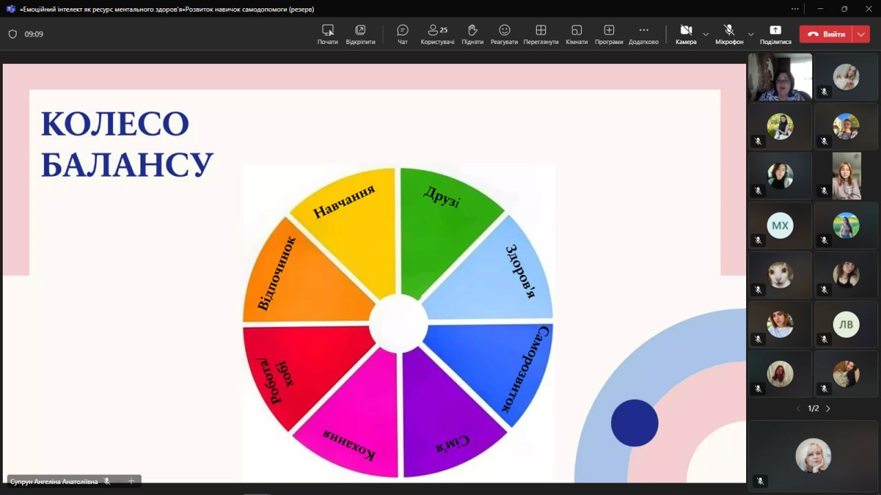 - Тренінг «Не вигоріти, коли горить дедлайн» — учасники працювали з «Колесом балансу» для виявлення дисбалансу в життєвих сферах та визначення зон, що потребують уваги.