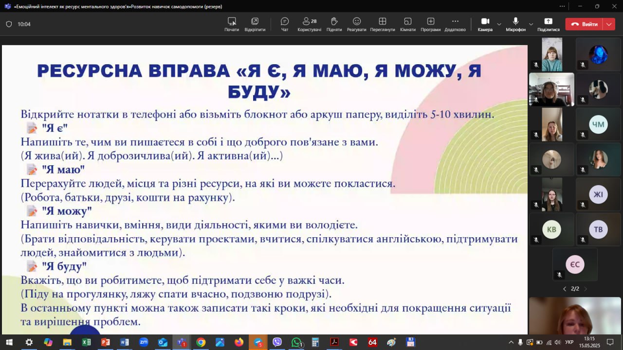 - Тренінг «Ментальне здоров’я — це не соромно» — серед вправ, запропонованих учасникам у цьому блоці, були ресурсна техніка «Я є, я маю, я можу, я буду», а також візуалізаційна практика «Мій ідеальний день», що допомагала формувати позитивний образ майбутнього. Учасники також виконували інші завдання, спрямовані на усвідомлення власних потреб, ресурсів та прийняття себе.