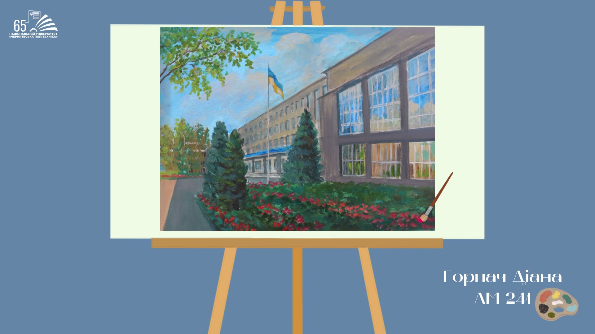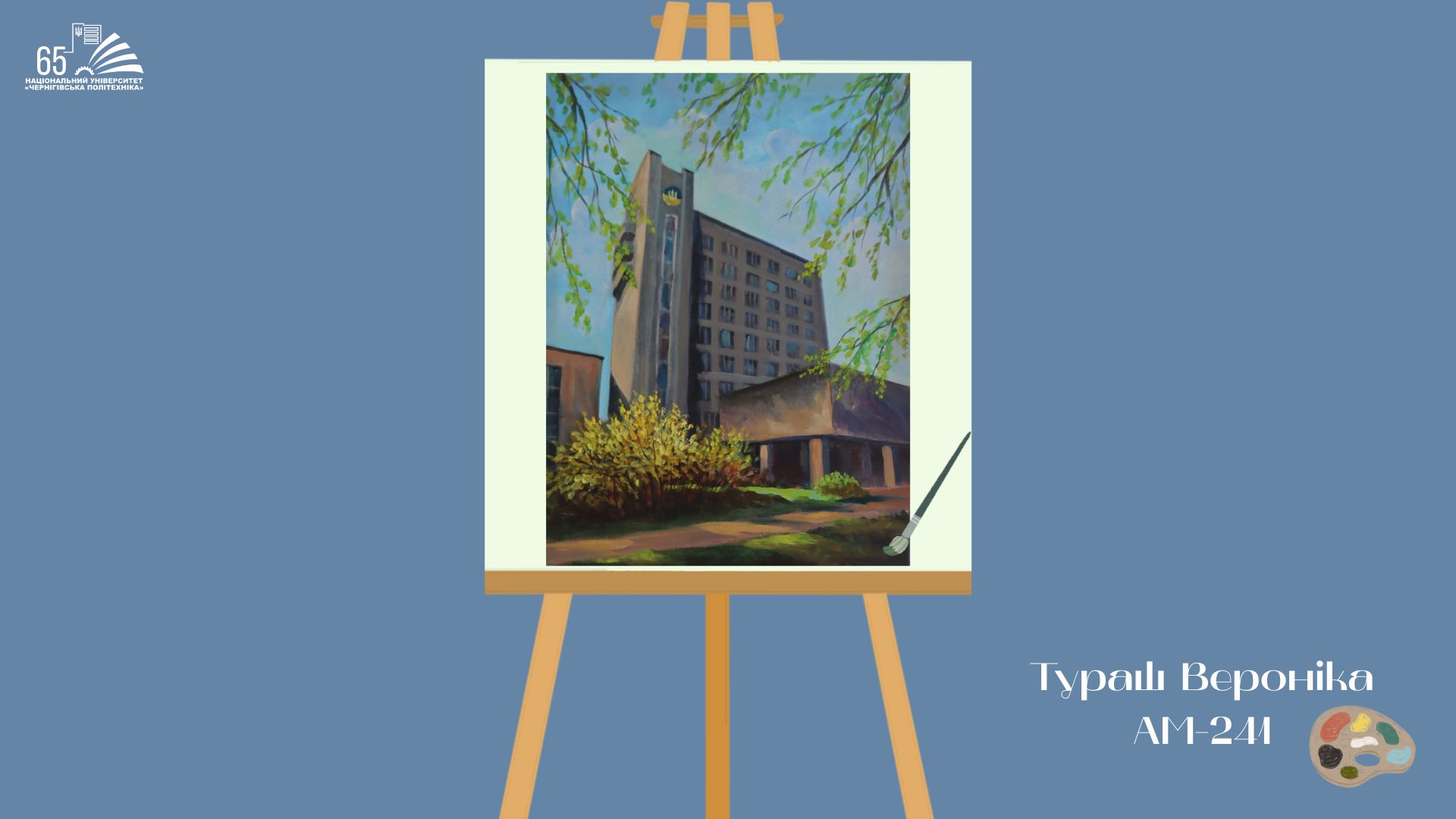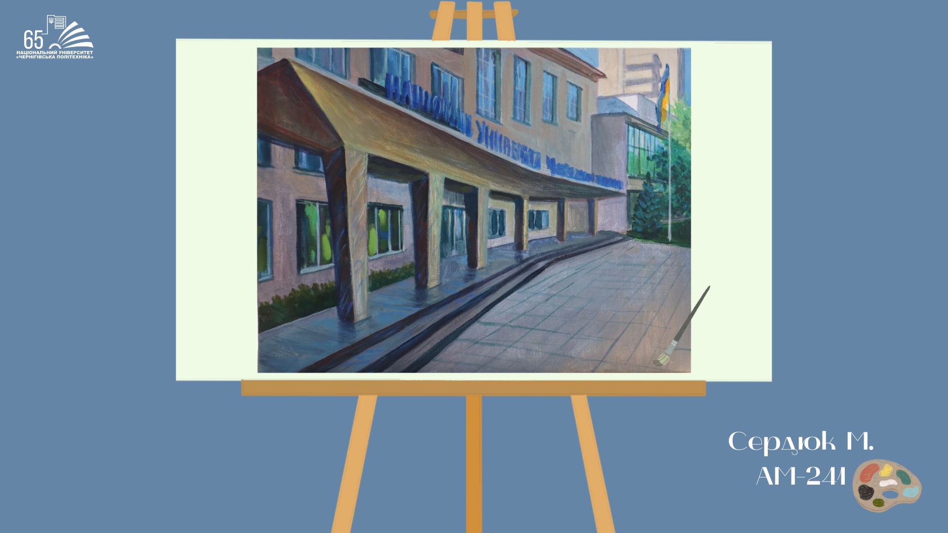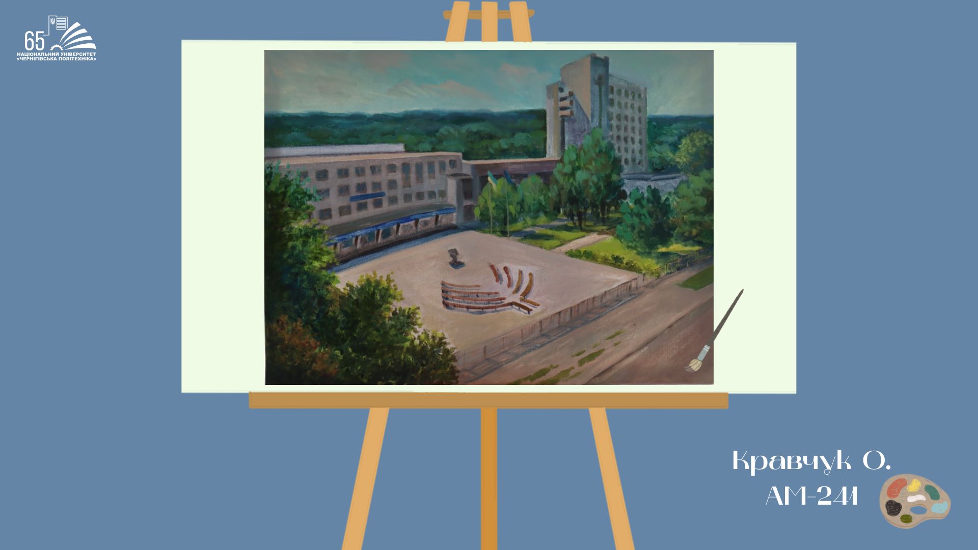 До 65-річчя Національного університету “Чернігівська політехніка” студенти групи АМ-241, що навчаються за освітньою програмою «Архітектура та містобудування», підготували творчий подарунок — серію картин із зображенням головного корпусу університету.