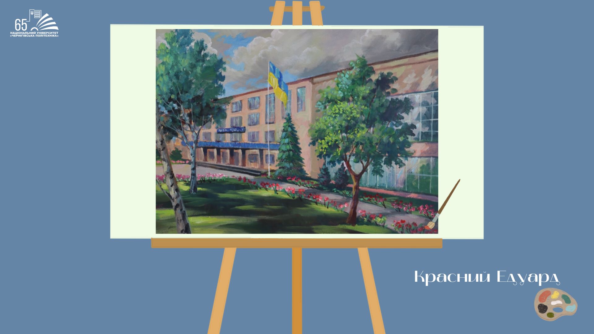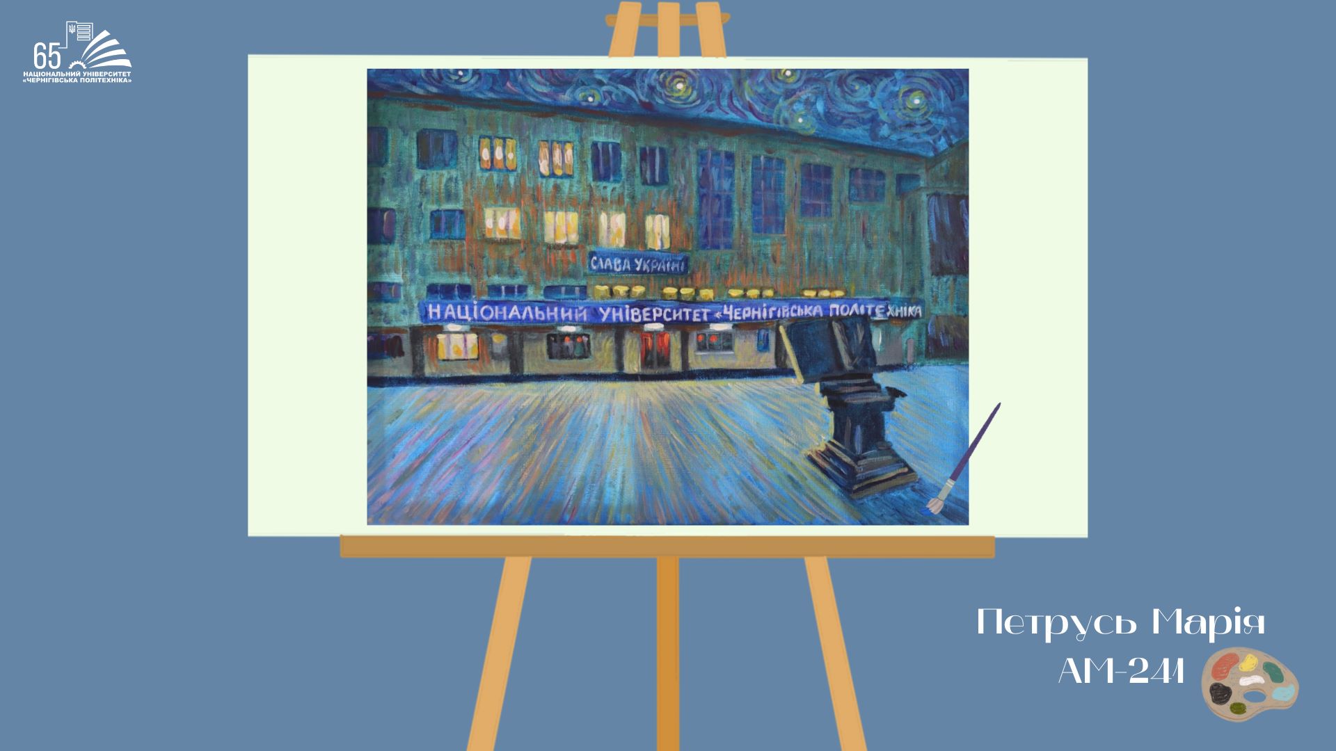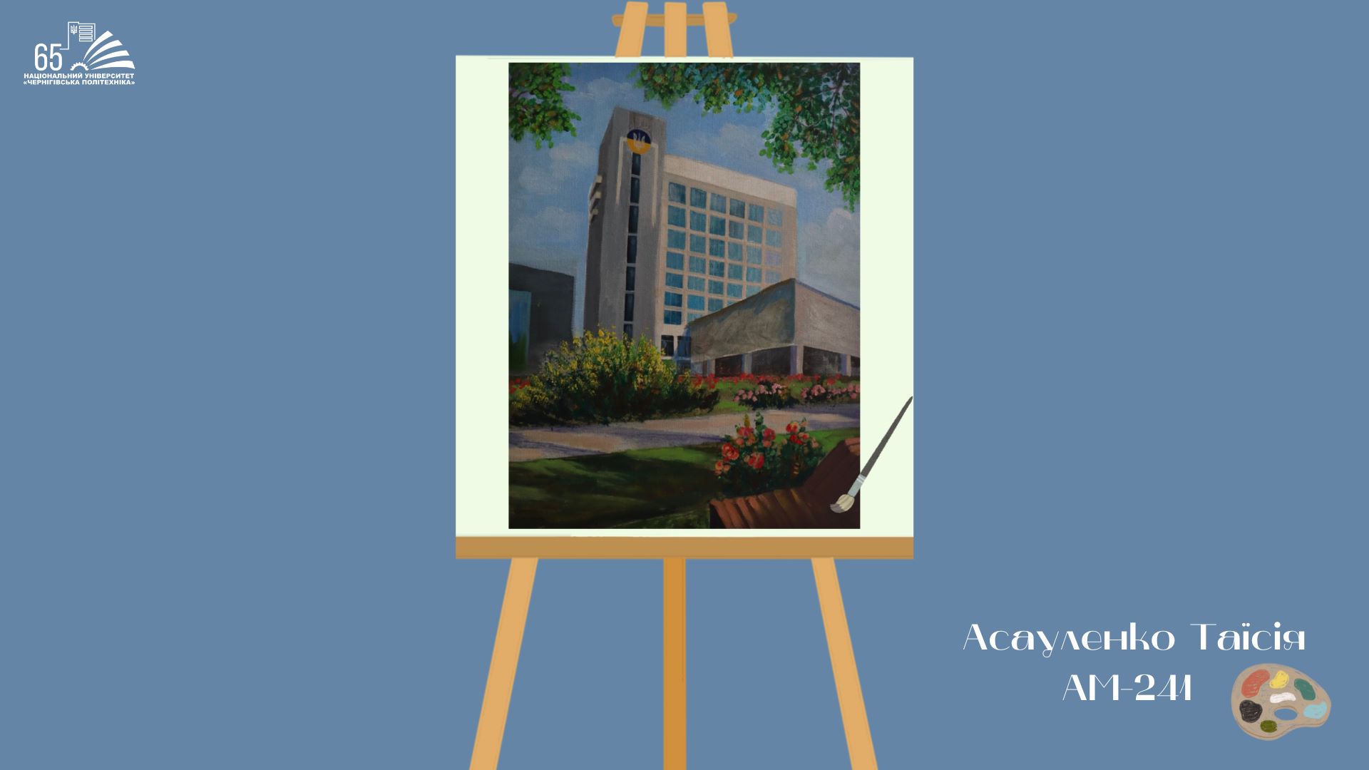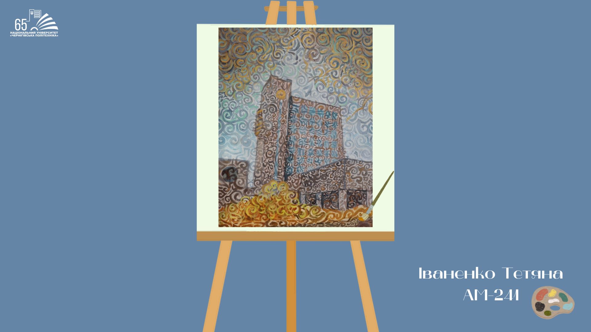 До 65-річчя Національного університету “Чернігівська політехніка” студенти групи АМ-241, що навчаються за освітньою програмою «Архітектура та містобудування», підготували творчий подарунок — серію картин із зображенням головного корпусу університету.