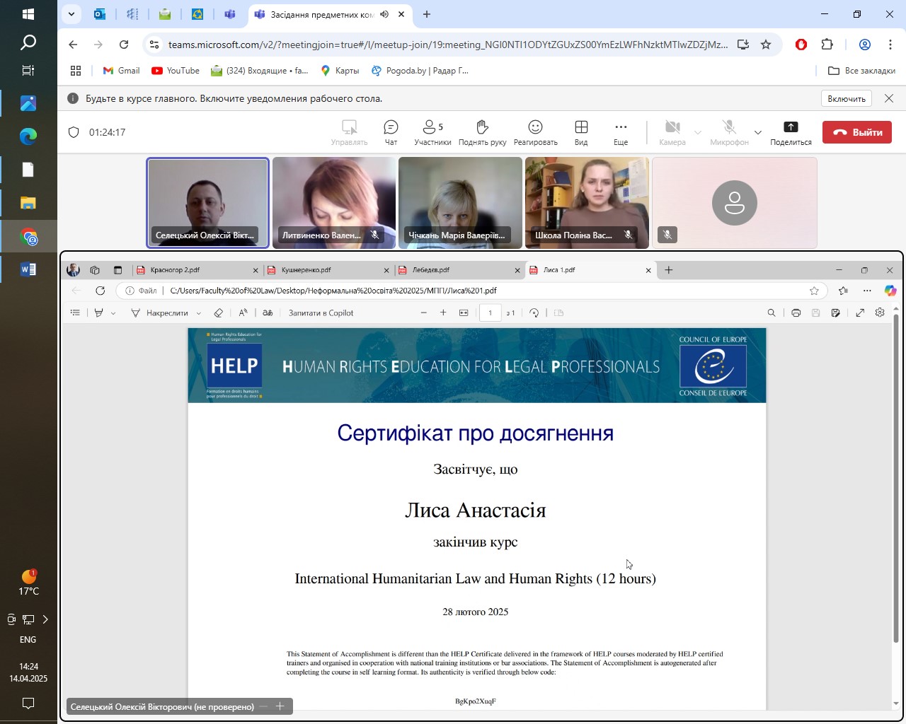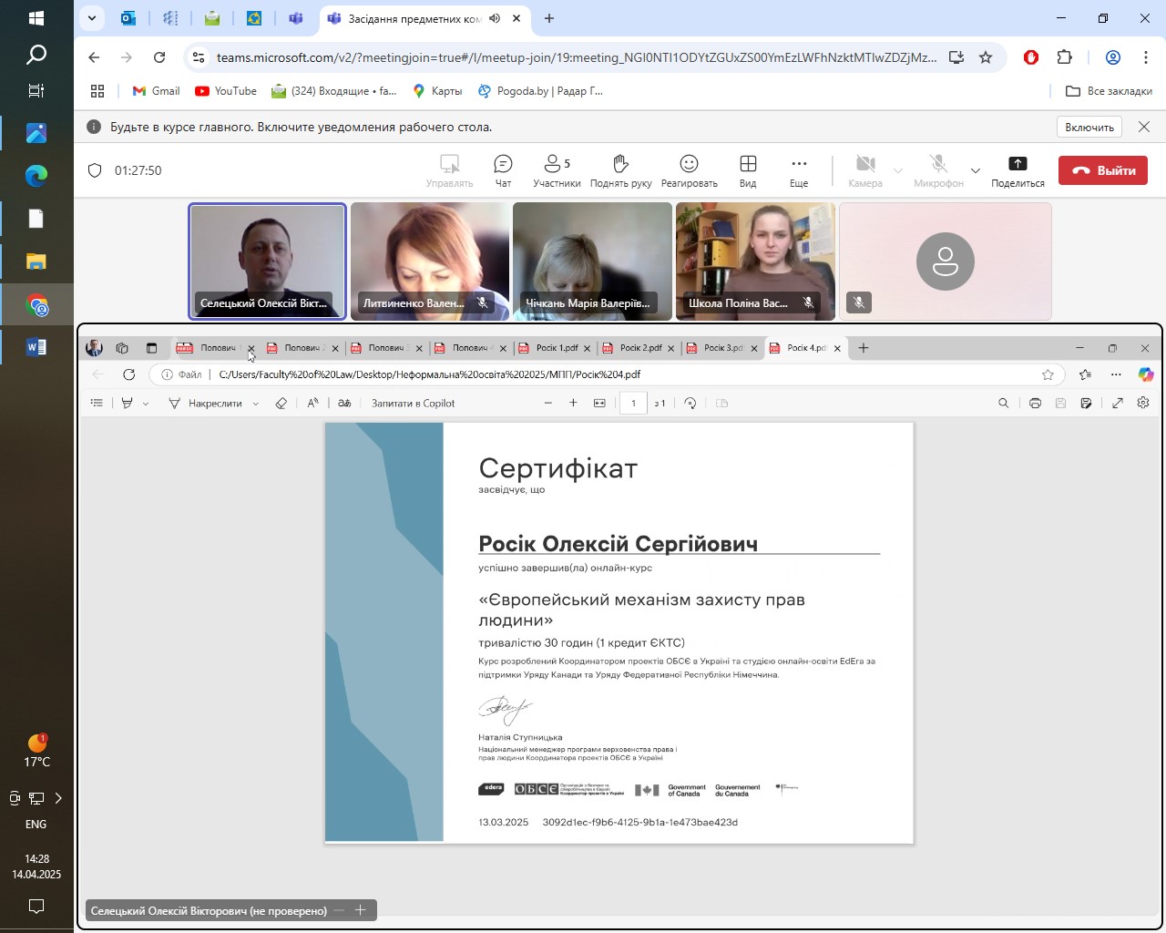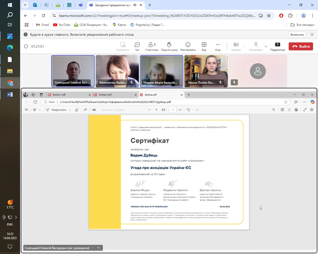 14 квітня 2025 року на юридичному факультеті відбулися засідання предметних комісій з валідування результатів неформальної освіти з освітніх компонентів «Правове регулювання адміністративних послуг» та «Міжнародне публічне право та право Європейського Союзу» для студентів першого (бакалаврського) рівня вищої освіти спеціальності 081 Право, освітніх програм «Право» та «Кримінальна юстиція (Суд. Прокуратура. Адвокатура)». Предметні комісії були створені відповідно до розпоряджень декана юридичного факультету.