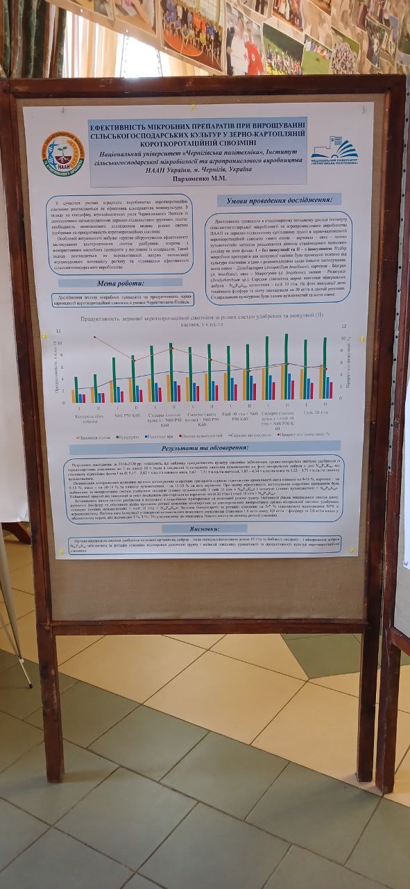 Пархоменко Мирослав Миколайович, завідувач навчально-наукової лабораторії екологічно-сталого природокористування представив результати наукових досліджень в стендовій доповіді «Ефективність мікробних препаратів при вирощуванні сільськогосподарських культур у зерно-картопляній короткоротаційній сівозміні».