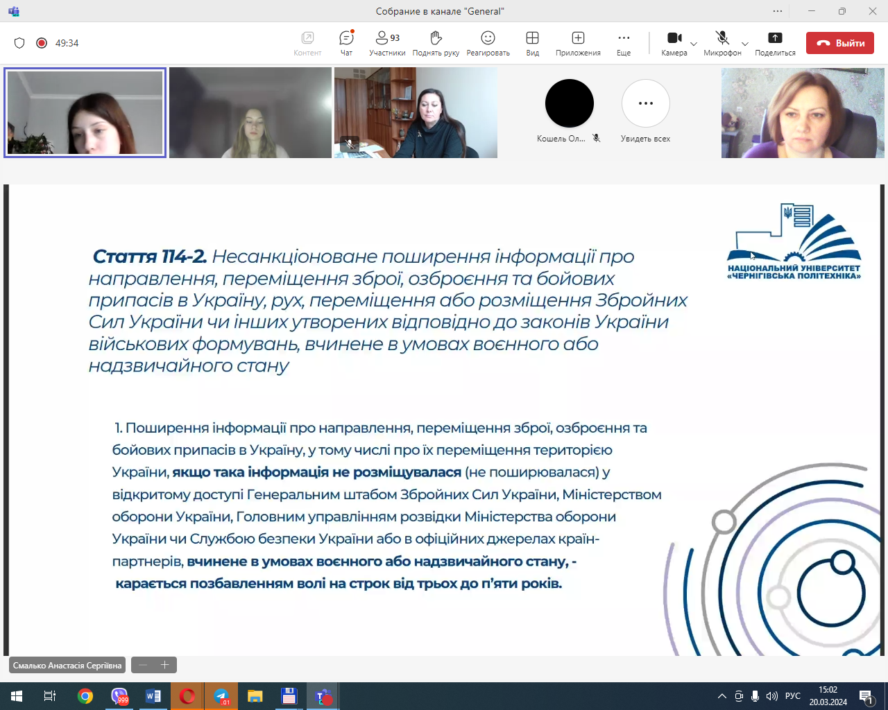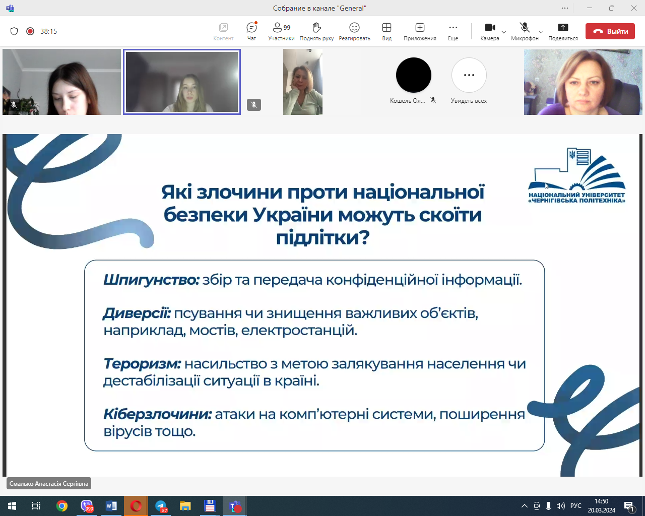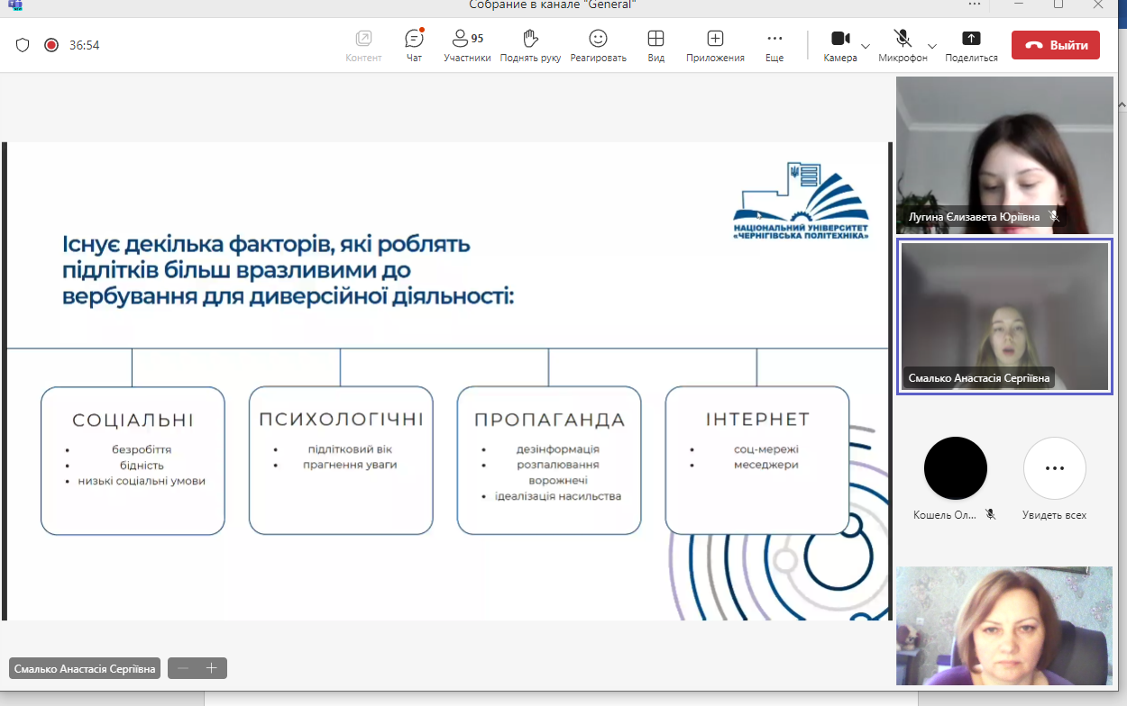 Учасники юридичної клініки, які брали активну участь у підготовці та проведенні кураторської години, Лугина Єлизавета (гр. ПР-221) Смалько Анастасія (гр. КЮ-221) та Дем’яненко Руслан (гр. КЮ-221) розкрили актуальність даної теми, зумовленої наявністю фактів причетності неповнолітніх громадян віком 14-16 років до вчинення кримінальних правопорушень, пов’язаних із підпалом обладнання, що забезпечує безпеку руху залізничного транспорту, ознайомили учасників кураторської години про міжнародні, національні та зарубіжні нормативно-правові акти, які забороняють вербування та використання дітей.