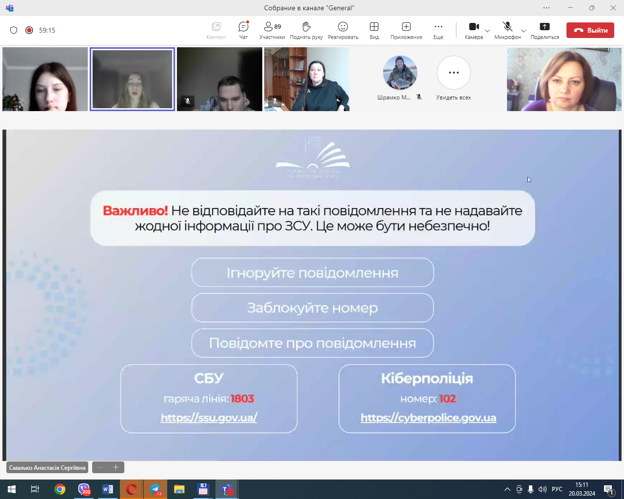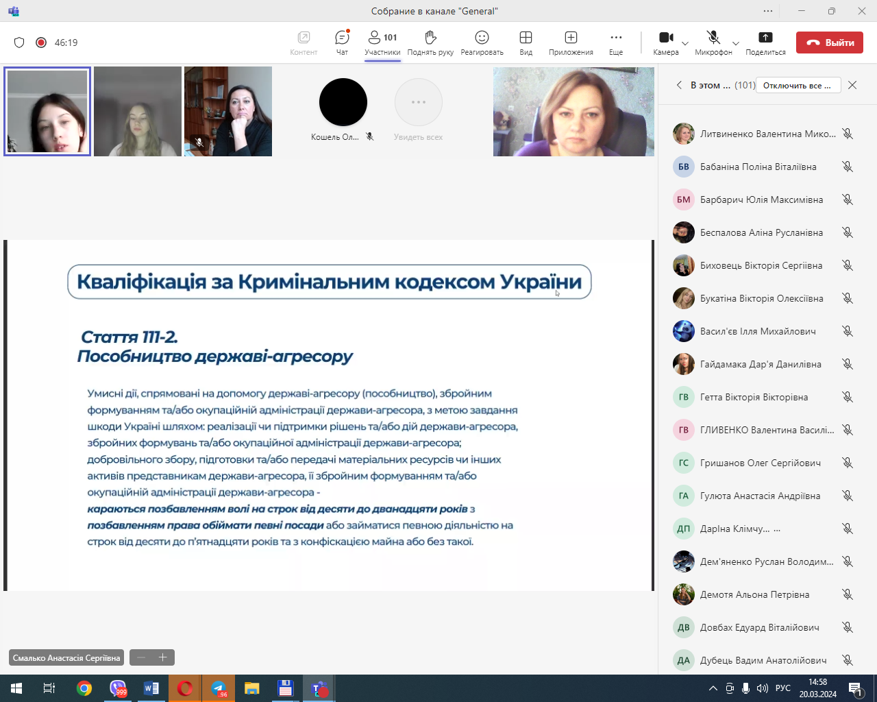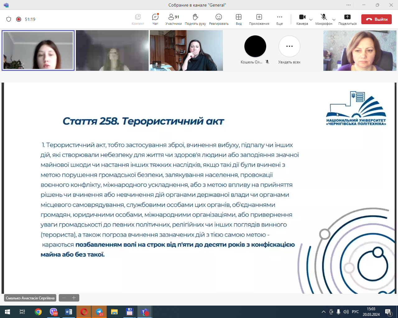Учасники юридичної клініки, які брали активну участь у підготовці та проведенні кураторської години, Лугина Єлизавета (гр. ПР-221) Смалько Анастасія (гр. КЮ-221) та Дем’яненко Руслан (гр. КЮ-221) розкрили актуальність даної теми, зумовленої наявністю фактів причетності неповнолітніх громадян віком 14-16 років до вчинення кримінальних правопорушень, пов’язаних із підпалом обладнання, що забезпечує безпеку руху залізничного транспорту, ознайомили учасників кураторської години про міжнародні, національні та зарубіжні нормативно-правові акти, які забороняють вербування та використання дітей.