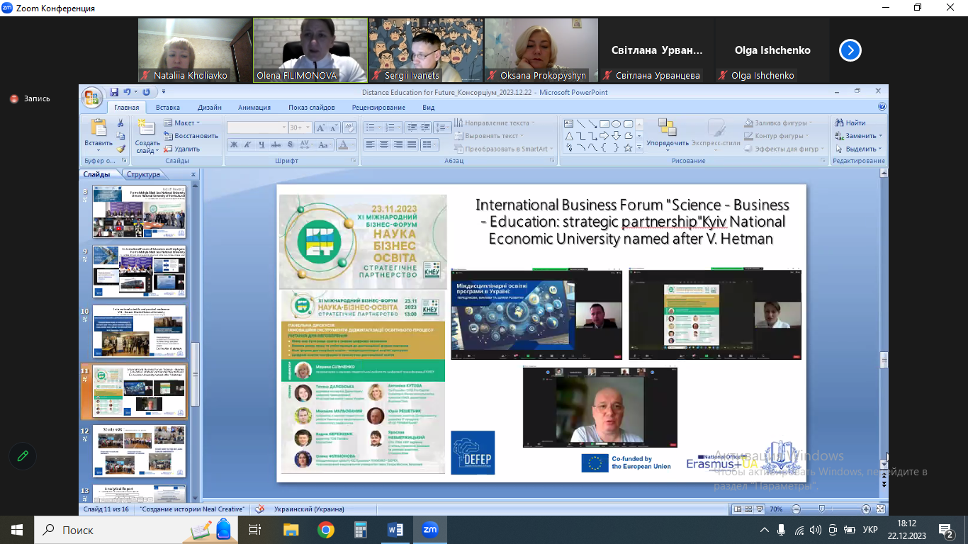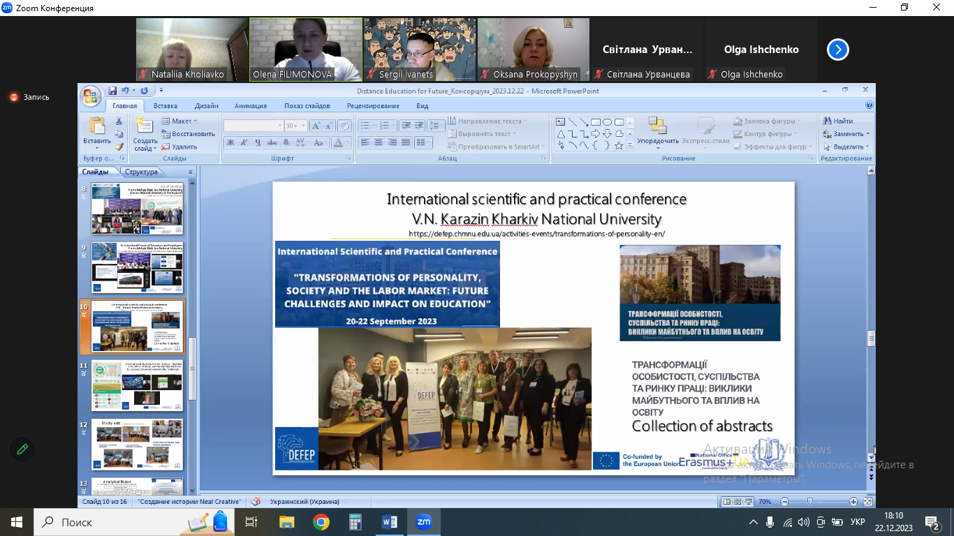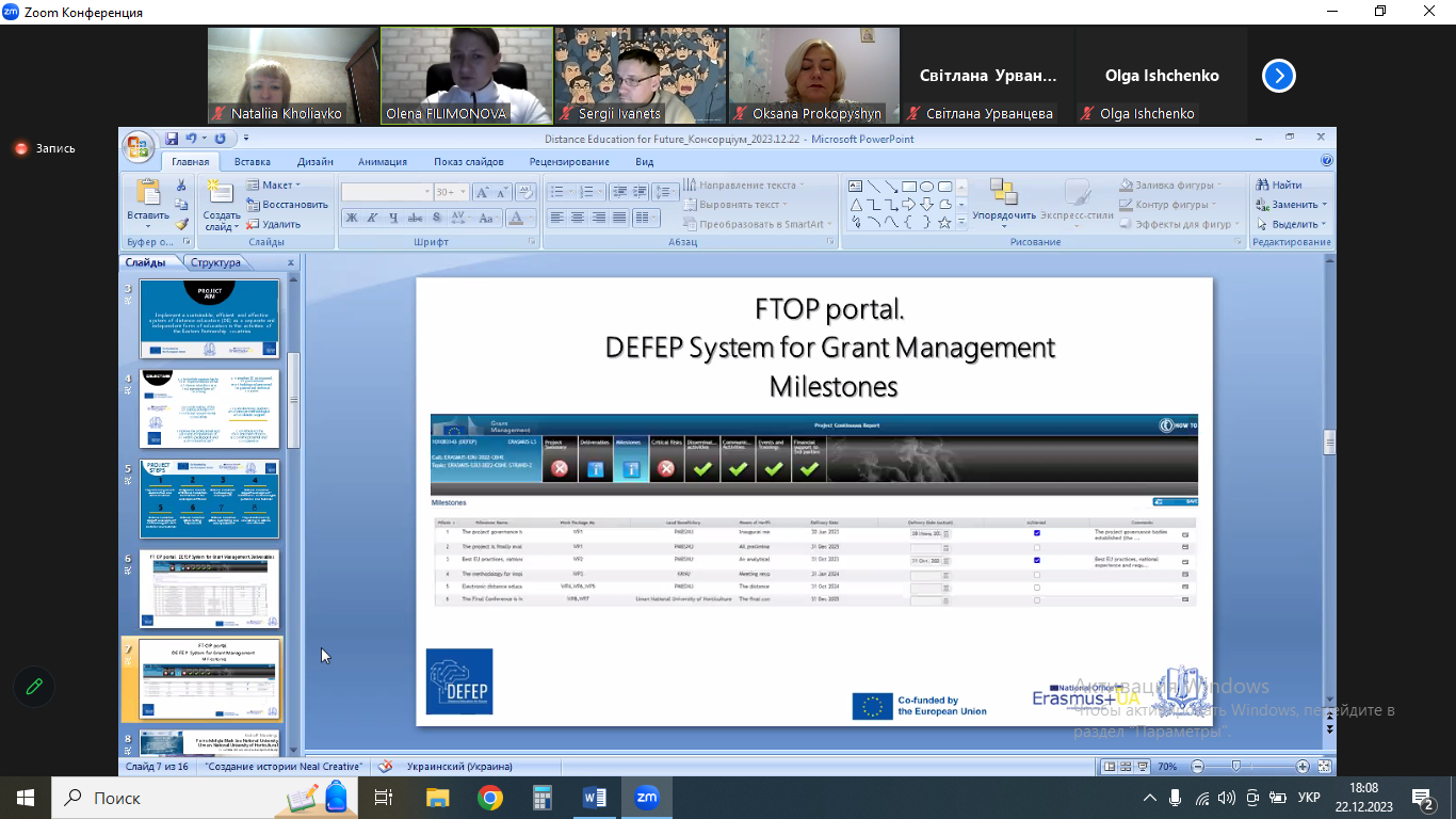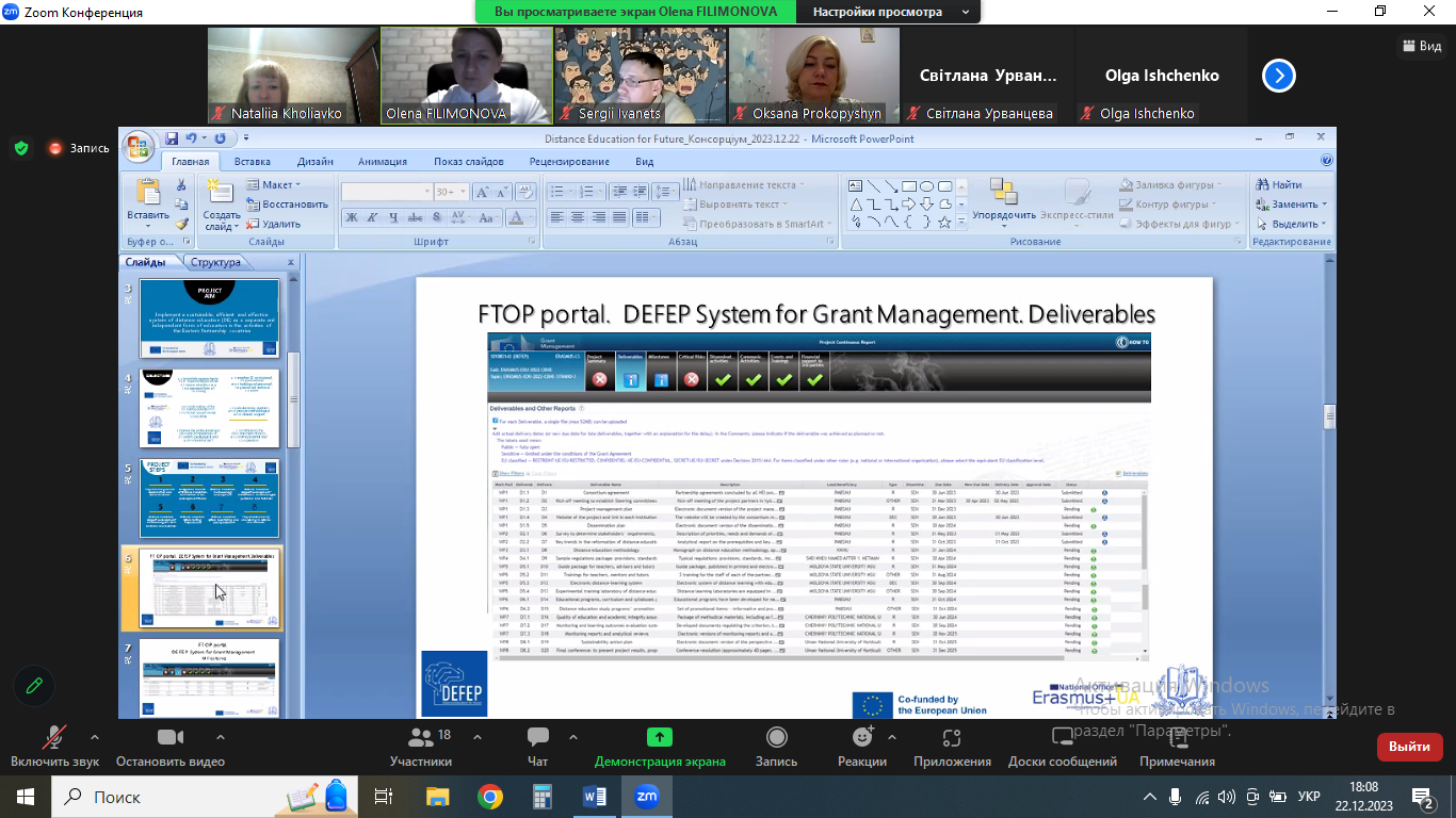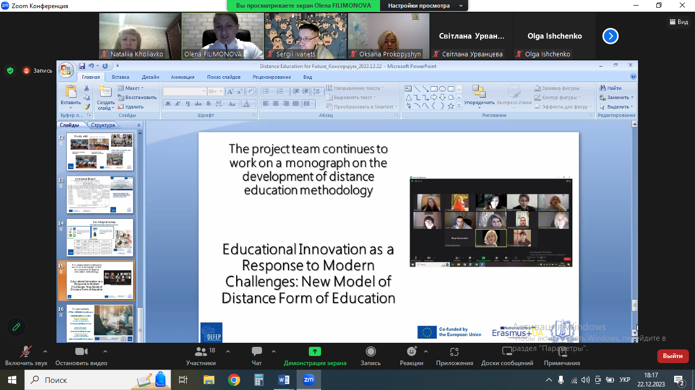 22 грудня 2023 року в онлайн-форматі відбулась зустріч виконавців проєкту Erasmus+ KA2 DEFEP «Дистанційна освіта для майбутнього: кращі практики ЄС у відповідь на запити здобувачів вищої освіти та ринку праці» («Distance Education for Future: best EU practices in response to the requests of modern higher education seekers and labor market»).