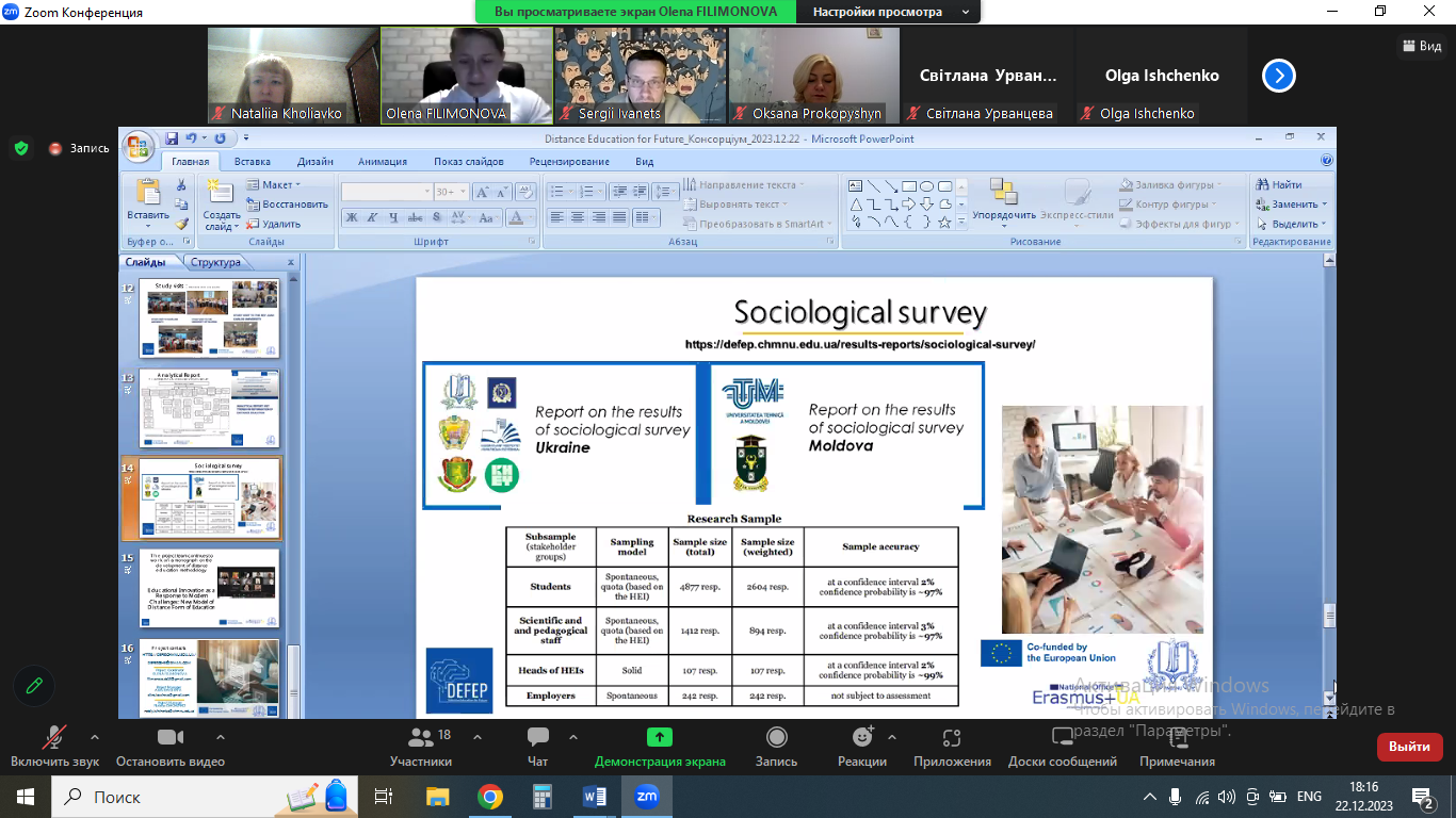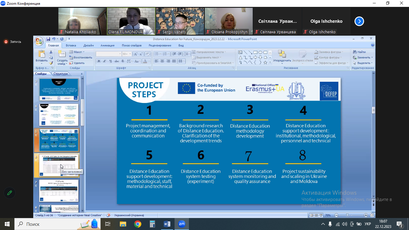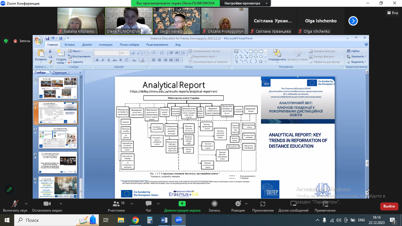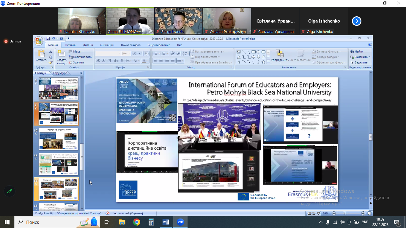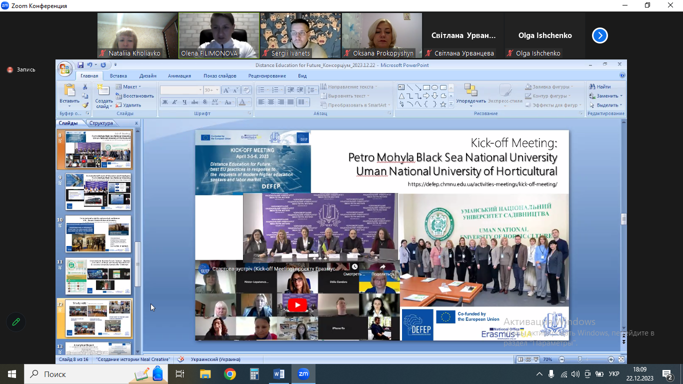 22 грудня 2023 року в онлайн-форматі відбулась зустріч виконавців проєкту Erasmus+ KA2 DEFEP «Дистанційна освіта для майбутнього: кращі практики ЄС у відповідь на запити здобувачів вищої освіти та ринку праці» («Distance Education for Future: best EU practices in response to the requests of modern higher education seekers and labor market»).